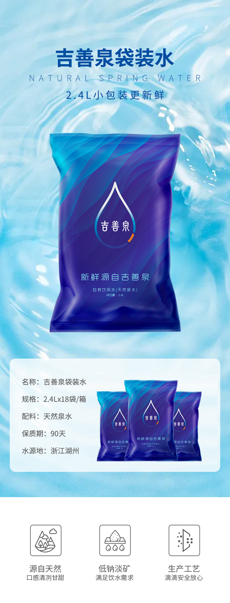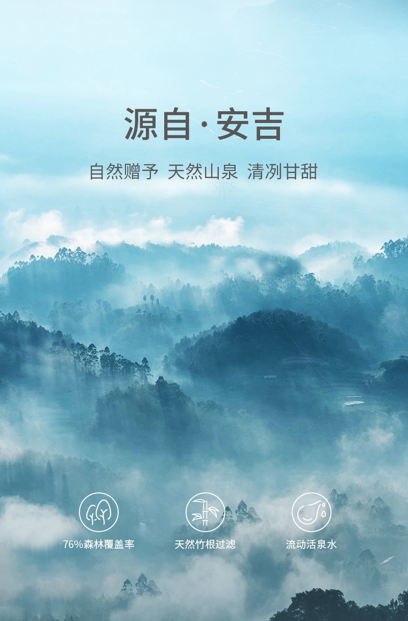 源自安吉竹海的饋贈(zèng),良好的生態(tài)環(huán)境,孕育出清冽甘甜的口感,滴滴鮮活,“袋”給全家泉心泉意的愛。