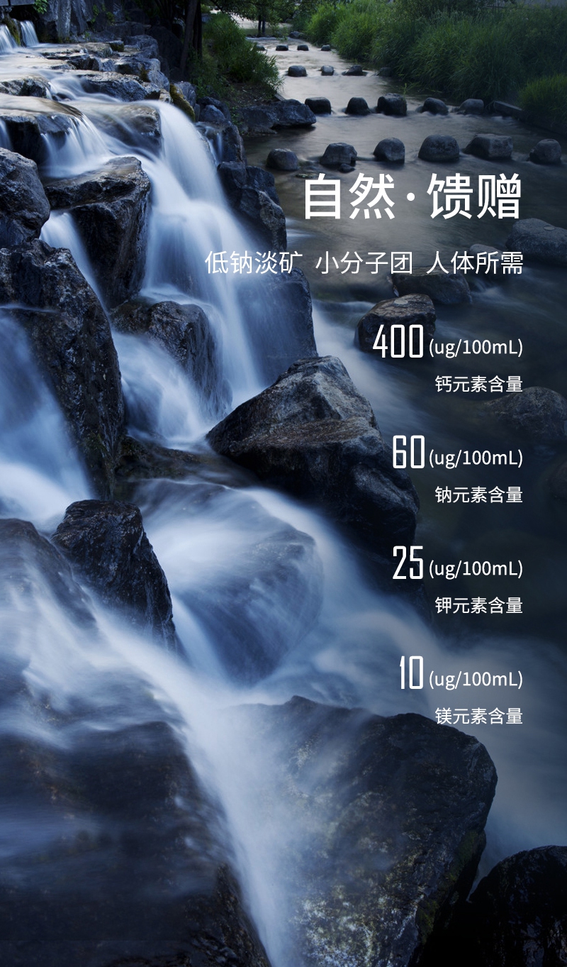 天然山泉|低鈉淡礦|小分子團(tuán)|先進(jìn)工藝|安全認(rèn)證