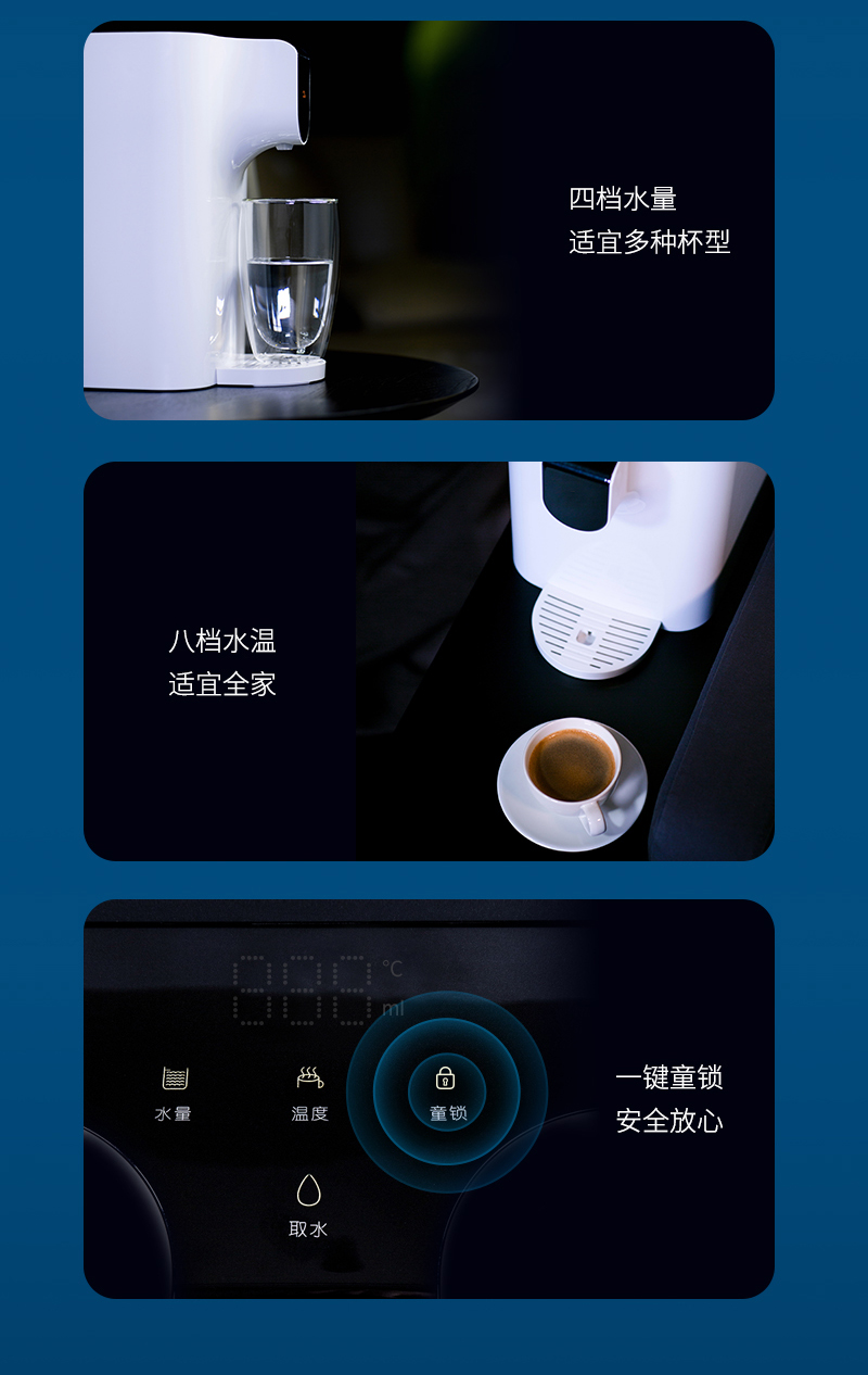 3秒快速加熱出水,轉(zhuǎn)瞬間擁有一杯溫度適宜的新鮮山泉水。8檔水溫可選,4檔水量調(diào)控,安全童鎖更放心,喝出健康鮮活水。