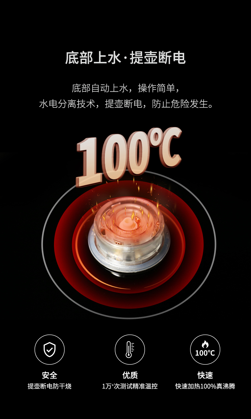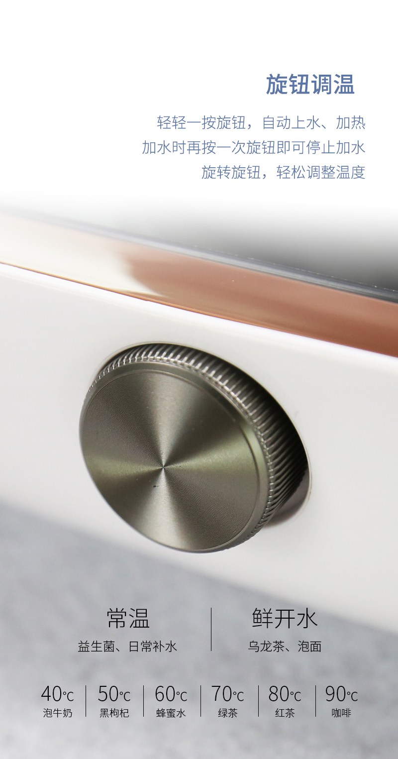 一個(gè)鋁合金操作旋鈕,操作一目了然。告別傳統(tǒng)水柱加水,全新升級(jí)涌泉式底部上水。智能浮球控制水量,有效杜絕溢水情況。
