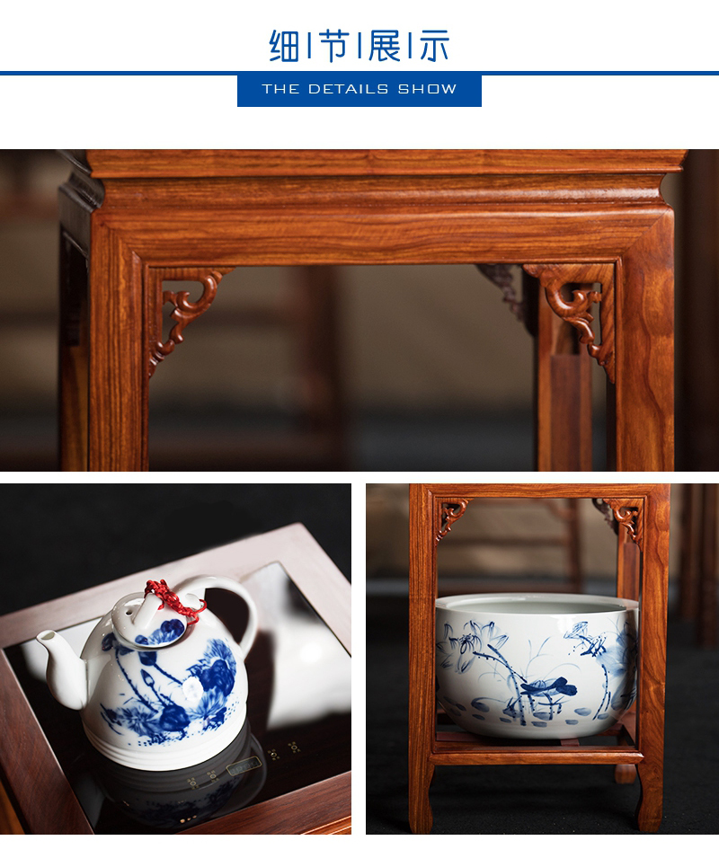 臻品花梨材質(zhì),古色古香、沉穩(wěn)厚重;陶瓷手繪壺、手繪缸,古典優(yōu)雅,光澤耐久。